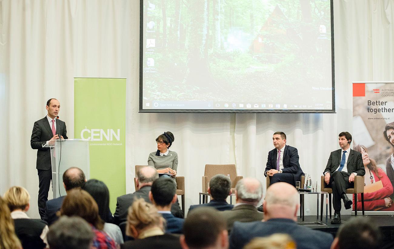 სასტუმრო „რედისონ ბლუ ივერიაში“ პროექტზე - „ევროპული გამოცდილება გარემოსდაცვითი და სატყეო პოლიტიკის განხორციელებისთვის“ იმსჯელეს. შეხვედრის მონაწილეებს გარემოს დაცვისა და სოფლის მეურნეობის მინისტრმა ლევან დავითაშვილმა და კავკასიის გარემოსდაცვითი არასამთავრობო ორგანიზაციების ქსელის (CENN) დირექტორმა ნანა ჯანაშიამ მიმართეს.შეხვედრა CENN- ის ორგანიზებით გაიმართა და მიზნად ისახავს ტყეების მდგრადი მართვის პოლიტიკური, ინსტიტუციური და ფინანსური ინსტრუმენტების გაცნობას და ერთიანი, დაბალანსებული სახელმწიფო პოლიტიკის განხორციელების შესაძლებლობების განხილვას ქვეყნის სოციალურ–ეკონომიკური და გარემოსდაცვითი პრიორიტეტების გათვალისწინებით.