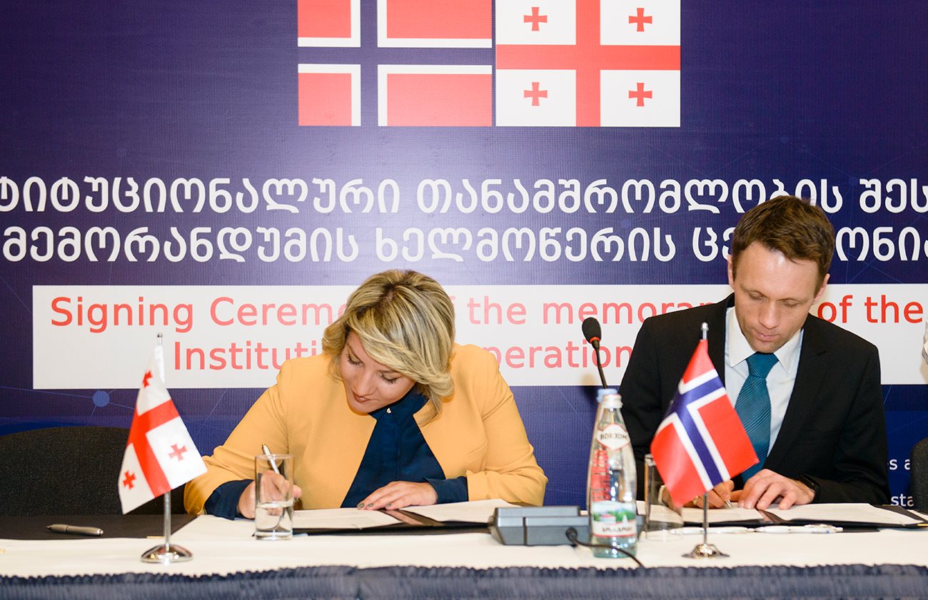 სასტუმრო „რედისონ ბლუ ივერია“-ში ნორვეგიის წყლის რესურსებისა და ენერგეტიკის დირექტორატს (NVE), გარემოს დაცვისა და სოფლის მეურნეობის სამინისტროს, ეკონომიკისა და მდგრადი განვითარების სამინისტროს, გარემოს ეროვნული სააგენტოს, სახელმწიფო ელექტროსისტემის, ტექნიკურ უნივერსიტეტს შორის ინსტიტუციონალური თანამშრომლობის შესახებ მემორანდუმი გაფორმდა.მემორანდუმს გარემოს დაცვისა და სოფლის მეურნეობის მინისტრის მოადგილემ ნინო თანდილაშვილმა, ეკონომიკისა და მდგრადი განვითარების მინისტრის მოადგილემ გიორგი ჩიქოვანმა და გარემოს ეროვნული სააგენტოს უფროსმა თამარ ბაგრატიამ მოაწერეს ხელი.