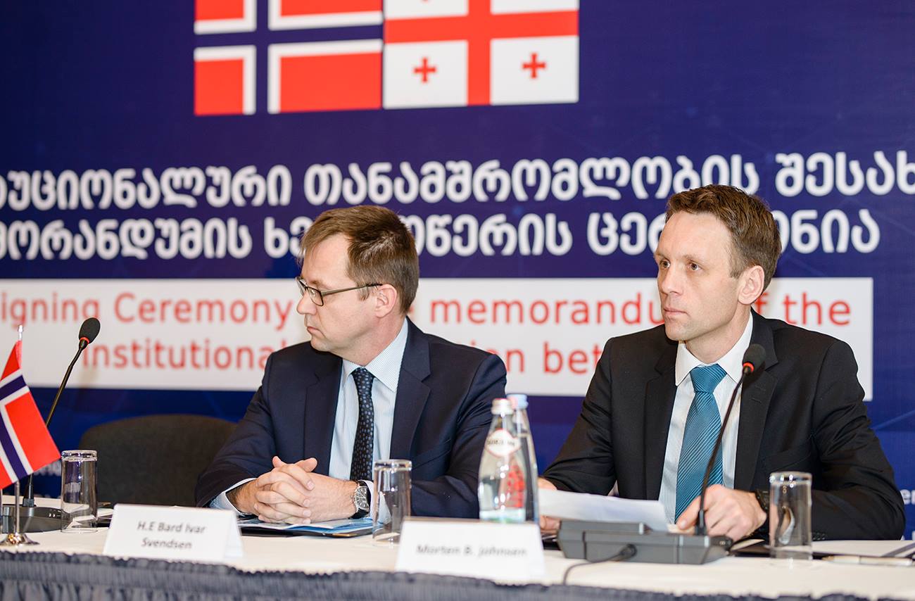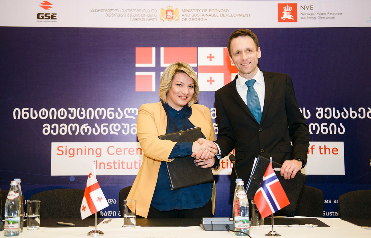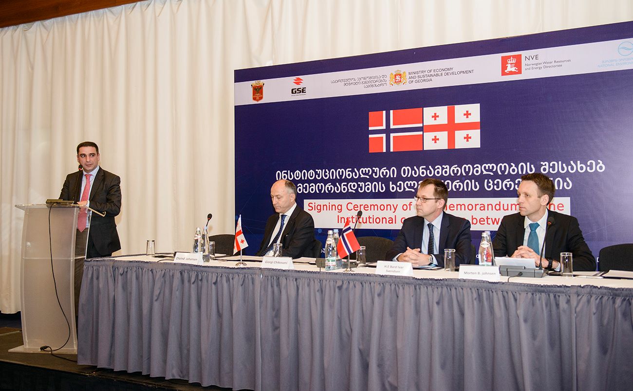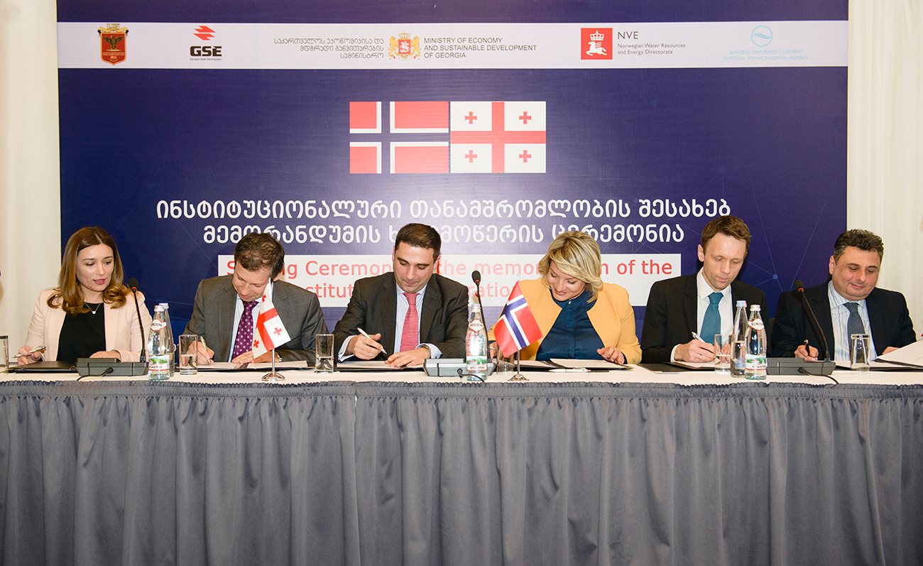 At Radisson Blu Iveria Hotel, the Memorandum on Institutional Cooperation was signed between Norwegian Water Resources and Energy Directorate (NVE), Ministry of Environmental Protection and Agriculture, Ministry of Economy and Sustainable Development, National Environmental Agency, State Electrosystem and Technical University.