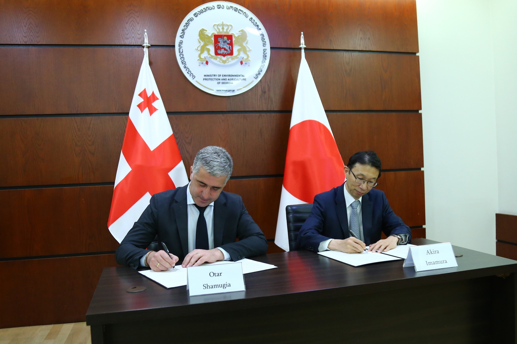 The Memorandum of Understanding on Bilateral Cooperation was signed between the Governments of Georgia and Japan within the Paris Agreement of the United Nations Framework Convention on Climate Change. The Memorandum was signed by the Minister of Environmental Protection and Agriculture of Georgia, Mr. Otar Shamugia and the Ambassador of Japan to Georgia, Mr. Imamura Akira.