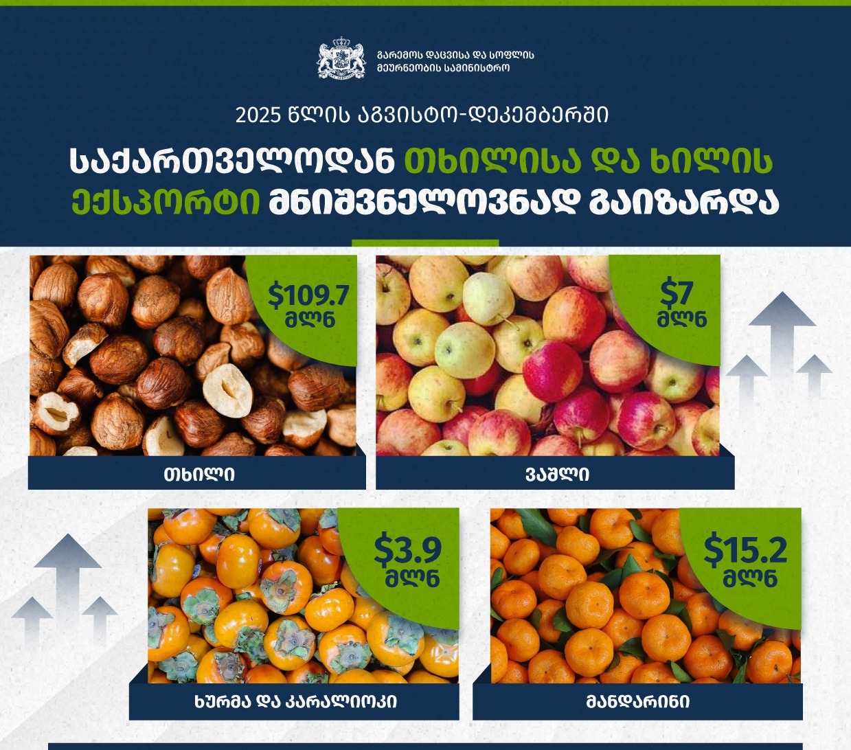 From August 1 to December 28, 2025, Georgia experienced a significant increase in exports of agri-food products, particularly hazelnuts and seasonal fruits.This growth was particularly evident in hazelnut exports: during the mentioned period, 10.9 thousand tonnes of hazelnuts were exported, with a total value of USD 109.7 million. Compared to the same period last year, export volume increased by 173.7 tonnes, while export revenue rose by 67% (an increase of USD 43.9 million). The average export price of hazelnuts reached USD 10.04 per kg, which is 69% higher than in the corresponding period of the previous year.