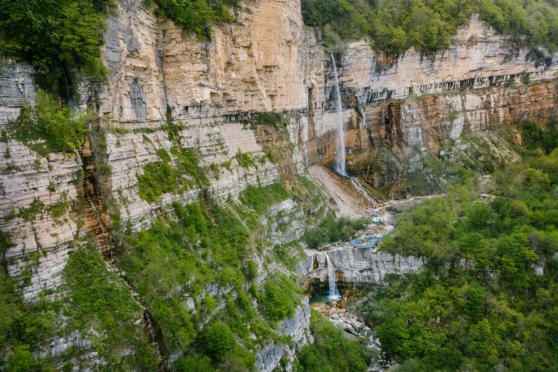 The Prime Minister of Georgia, Mamuka Bakhtadze, together with the Minister of Environmental Protection and Agriculture, Levan Davitashvili visited the village Kinchkha, Khoni municipality. The aim of the Government officials visit was to see the new eco-tourism infrastructure arranged on the Natural waterfall Okatse, which was organized by the Protected Areas of Georgia. Walking trails and observation platforms have been arranged as well as a Visitors Center at the natural monument, which will make the experience of tourists safer and more comfortable. The infrastructure project was funded with GEL 1,100,000 from the state budget. Okatse Waterfall is a distinctive monument of Georgia's protected areas and one of the greatest three cascade waterfalls in Georgia. Along the canyon, several waterfalls can be found, the height of one 70 meters.