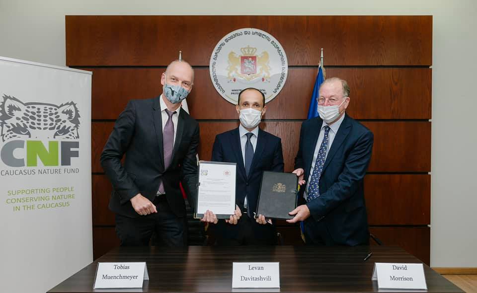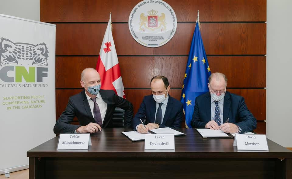 მემორანდუმს, რომელიც საქართველოს დაცული ტერიტორიების სისტემის გაფართოების და განვითარების ფინანსურ მხარდაჭერას ითვალისწინებს, გარემოს დაცვისა და სოფლის მეურნეობის მინისტრმა, ლევან დავითაშვილმა, კავკასიის ბუნების ფონდის (CNF) სამეთვალყურეო საბჭოს თავმჯდომარემ, დევიდ მორისონმა და CNF-ის აღმასრულებელმა დირექტორმა, თობიას მიუნხმაიერმა მოაწერეს ხელი.