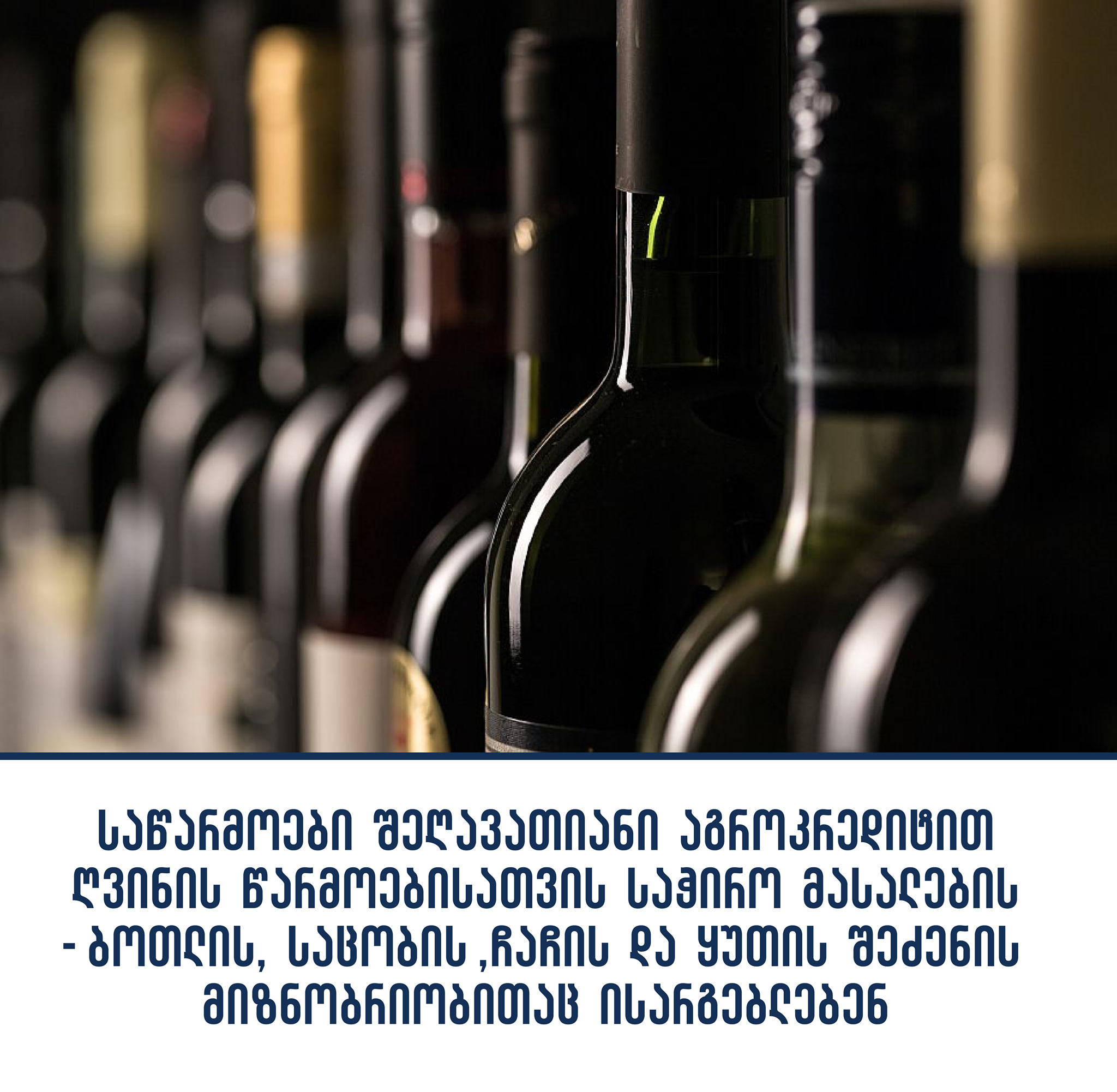 საწარმოები შეღავათიანი აგროკრედიტით ღვინის წარმოებისათვის საჭირო მასალების - ბოთლის, საცობის, ჩაჩის და ყუთის შეძენის მიზნობრიობითაც ისარგებლებენ