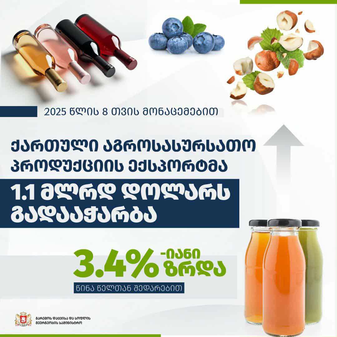 2025 წლის 8 თვის მონაცემებით საქართველოს აგროსასურსათო პროდუქციის ექსპორტმა 1.1 მლრდ დოლარს გადააჭარბა