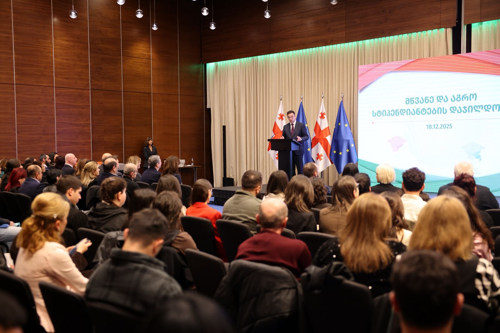 გარემოს დაცვისა და სოფლის მეურნეობის მინისტრმა დავით სონღულაშვილმა, განათლების, მეცნიერების და ახალგაზრდობის მინისტრის მოადგილე ბაია კვიციანმა, გაეროს განვითარების პროგრამის (UNDP) მუდმივმა წარმომადგენელმა საქართველოში დაგლას უებმა, საქართველოს პარლამენტის გარემოს დაცვისა და ბუნებრივი რესურსების კომიტეტის თავმჯდომარე მაია ბითაძემ და სოფლის მეურნეობის კომიტეტის თავმჯდომარე გელა სამხარაულმა „მწვანე და აგრო სტიპენდიების“ პროგრამის გამარჯვებული სტუდენტები დააჯილდოვეს.