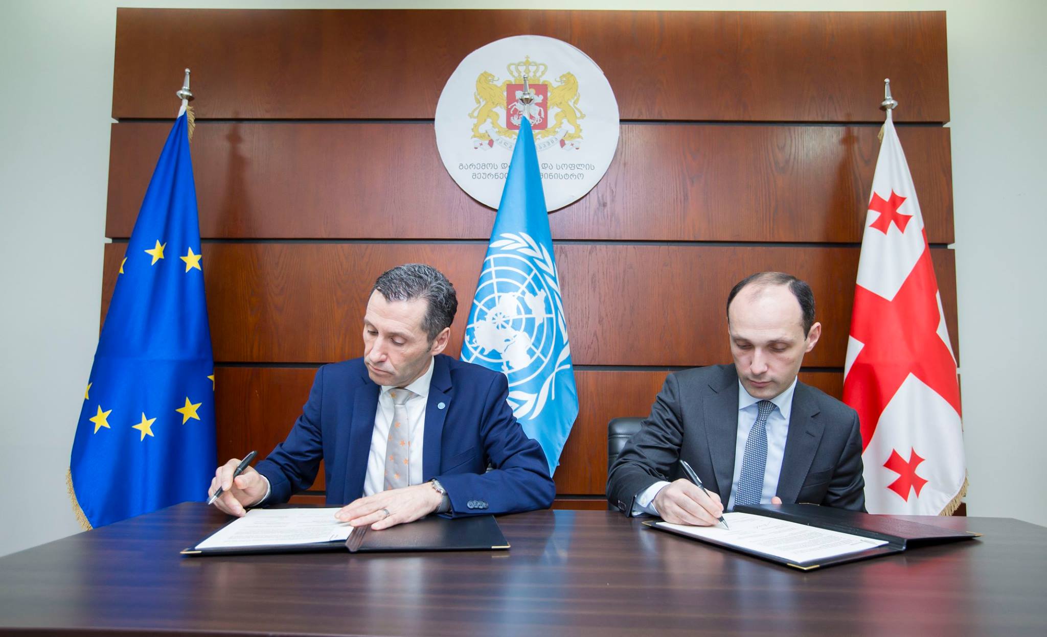 გარემოს დაცვისა და სოფლის მეურნეობის მინისტრმა, ლევან დავითაშვილმა და გაეროს სურსათისა და სოფლის მეურნეობის ორგანიზაციის (FAO) წარმომადგენელმა საქართველოში, რაიმუნდ იელემ ევროკავშირის ENPARD-ის III ფაზის ფარგლებში სოფლის მეურნეობის განვითარების ხუთწლიანი პროექტის განხორციელების შეთანხმებას მოაწერეს ხელი.„დღეს ხელი მოვაწერეთ საქართველოში სოფლის მეურნეობის განვითარებისთვის ევროკავშირის მხარდაჭერით 12 მილიონი ევროს ღირებულების პროექტის განხორციელების შეთანხმებას, რომელიც მნიშვნელოვანია ჩვენი ქვეყნის სოფლის მეურნეობის დარგის განვითარებისთვის. ამ პროექტის დიდი ნაწილი, გრანტების სახით, პირდაპირ იქნება მიმართული ჩვენი ფერმერების და მეწარმეობის ხელშესაწყობად. ამავე დროს, გაგრძელდება ის დახმარება, რომელიც სამინისტროს შესაძლებლობების ზრდას უკავშირდება და ENPARD-ის პირველი ფაზის ფარგლებშიც ხორციელდებოდა. ევროკავშირის დახმარებით, საქართველოს სოფლის მეურნეობისა და სოფლის განვითარების კუთხით ძალიან მნიშვნელოვანი ახალი ფაზა იწყება“, - განაცხადა ლევან დავითაშვილმა.