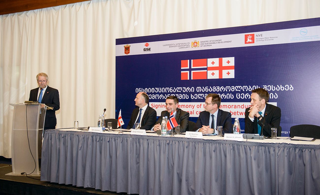 სასტუმრო „რედისონ ბლუ ივერია“-ში ნორვეგიის წყლის რესურსებისა და ენერგეტიკის დირექტორატს (NVE), გარემოს დაცვისა და სოფლის მეურნეობის სამინისტროს, ეკონომიკისა და მდგრადი განვითარების სამინისტროს, გარემოს ეროვნული სააგენტოს, სახელმწიფო ელექტროსისტემის, ტექნიკურ უნივერსიტეტს შორის ინსტიტუციონალური თანამშრომლობის შესახებ მემორანდუმი გაფორმდა.მემორანდუმს გარემოს დაცვისა და სოფლის მეურნეობის მინისტრის მოადგილემ ნინო თანდილაშვილმა, ეკონომიკისა და მდგრადი განვითარების მინისტრის მოადგილემ გიორგი ჩიქოვანმა და გარემოს ეროვნული სააგენტოს უფროსმა თამარ ბაგრატიამ მოაწერეს ხელი.
