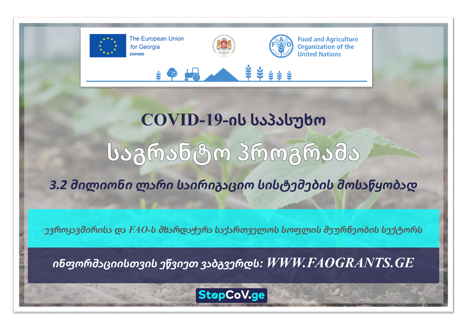 15 მაისი, 2020. თბილისი - ახალი კორონავირუსის (COVID-19) პანდემიით ქვეყანაში არსებული გამოწვევების საპასუხოდ, სოფლის მეურნეობის დარგის და ადგილობრივი ფერმერების მხარდასაჭერად, ევროკავშირმა (EU), გაეროს სურსათისა და სოფლის მეურნეობის ორგანიზაციამ (FAO), საქართველოს გარემოს დაცვისა და სოფლის მეურნეობის სამინისტროსთან კოორდინაციით დაფინანსების მექანიზმი - საგრანტო თანადაფინანსების პროგრამა შეიმუშავეს. ფერმერებსა და მცირე მეწარმეებს თანამედროვე საირიგაციო სისტემების შეძენისა და დამონტაჟებისთვის შესაძლებლობა ექნებათ საგრანტო პროგრამის ფარგლებში, თანადაფინანსება მიიღონ. საგრანტო პროგრამისთვის, საერთო ჯამში 3.2 მილიონი ლარი გამოიყო. აღნიშნული პროგრამა ნაწილია ევროკავშირის ფართომასშტაბიანი საგრანტო ინიციატივისა, რომლის საერთო ღირებულება 19 მილიონ ლარს აღემატება. ფერმერთა საგრანტო თანადაფინანსების პროგრამა „სოფლისა და სოფლის მეურნეობის განვითარების ევროპის სამეზობლო პროგრამის“ (ENPARD) ფარგლებში ხორციელდება.