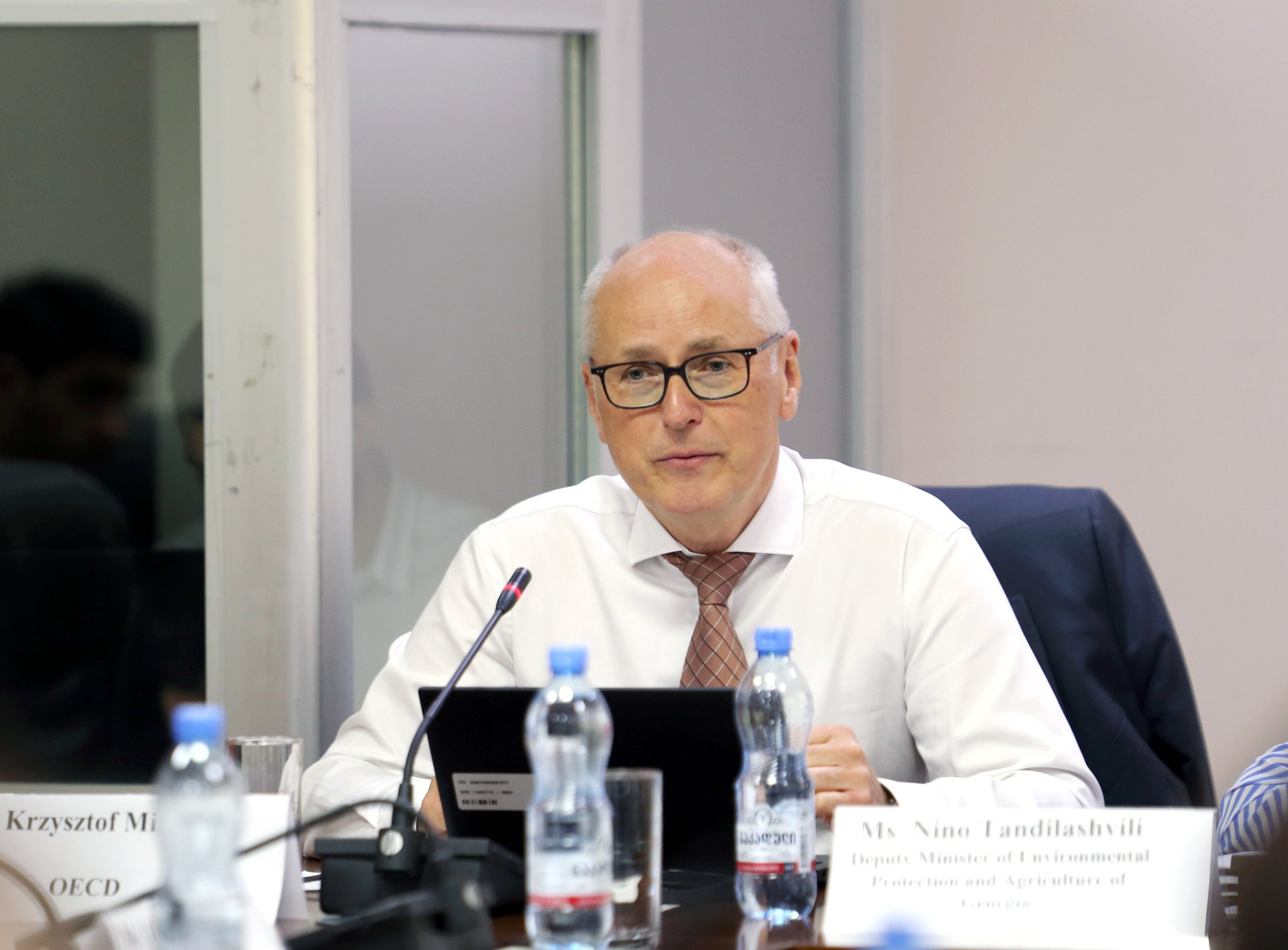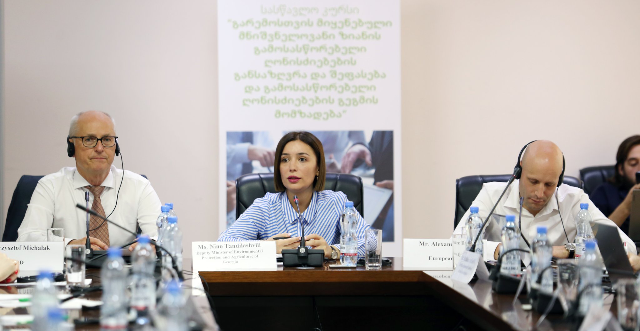 გარემოს დაცვისა და სოფლის მეურნეობის მინისტრის მოადგილე ნინო თანდილაშვილი, ევროკავშირის წარმომადგენელი ალექსანდრე დარასი და ეკონომიკური თანამშრომლობისა და განვითარების ორგანიზაციის (OECD) წარმომადგენელი კრიშტოფ მიხალაკი გარემოსდაცვითი პასუხისმგებლობის შესახებ ტრენინგის დაწყების ღონისძიებას დაესწრნენ.