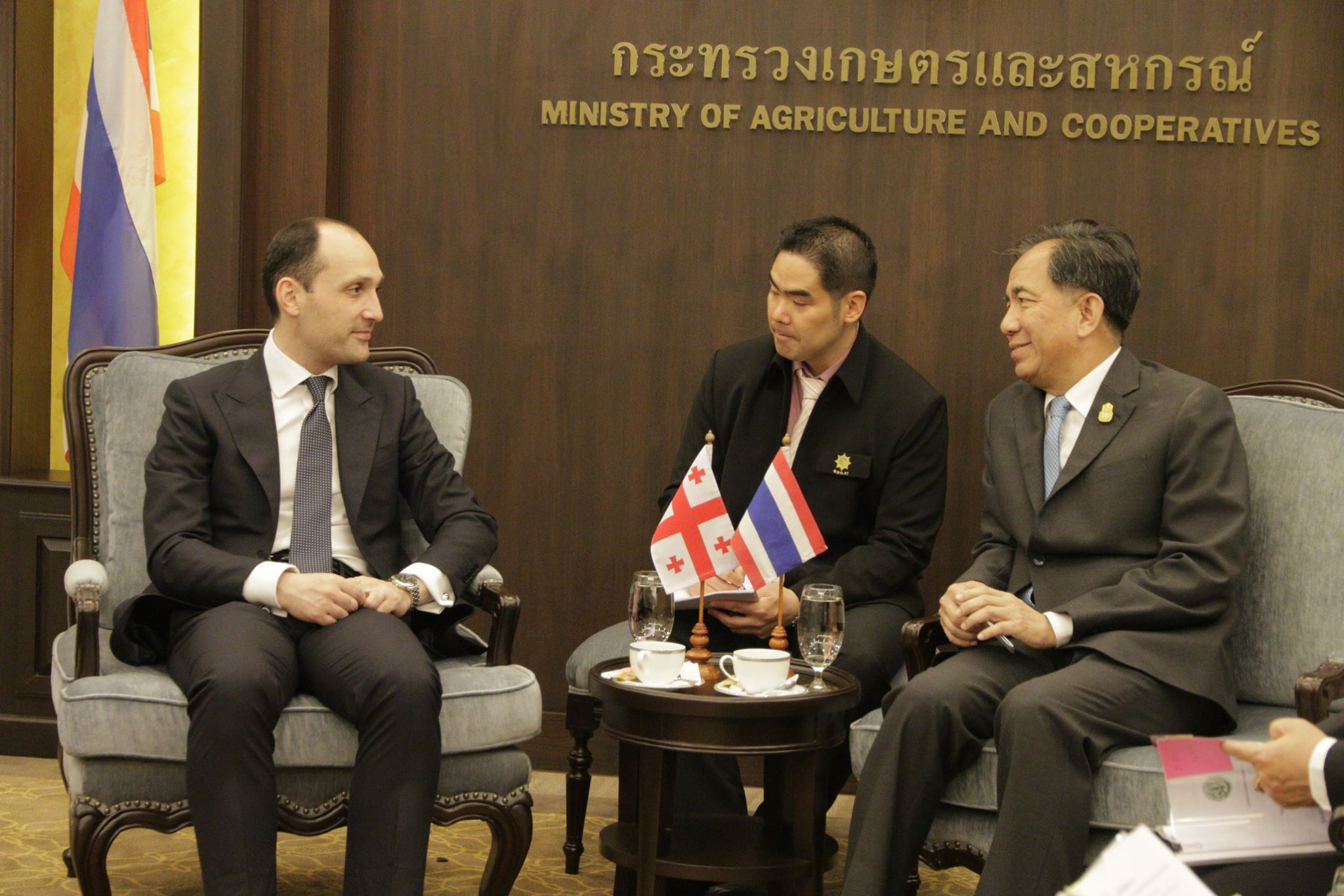 საქართველოს გარემოს დაცვისა და სოფლის მეურნეობის მინისტრი ლევან დავითაშვილი ტაილანდის სამეფოს დედაქალაქ ბანგკოკში ვიზიტის ფარგლებში ტაილანდის სოფლის მეურნეობისა და კოოპერატივების მინისტრს, გრისადა ბუნრახს შეხვდა. ტაილანდის სოფლის მეურნეობისა და კოოპერატივების სამინისტროში გამართულ შეხვედრაზე მხარეებმა ორ ქვეყანას შორის თანამშრომლობის არსებულ პოტენციალზე ისაუბრეს.შეხვედრაზე ლევან დავითაშვილმა საქართველოში განხორციელებულ რეფორმებსა და ეკონომიკურ სფეროში მიღწევებზე ისაუბრა და ხაზგასმით აღნიშნა, რომ ტაილანდის სამეფოსთან, როგორც რეგიონის წამყვან ქვეყანასთან, ორმხრივი ეკონომიკური ურთიერთობების გაღრმავება ერთ-ერთ პრიორიტეტს წარმოადგენს.