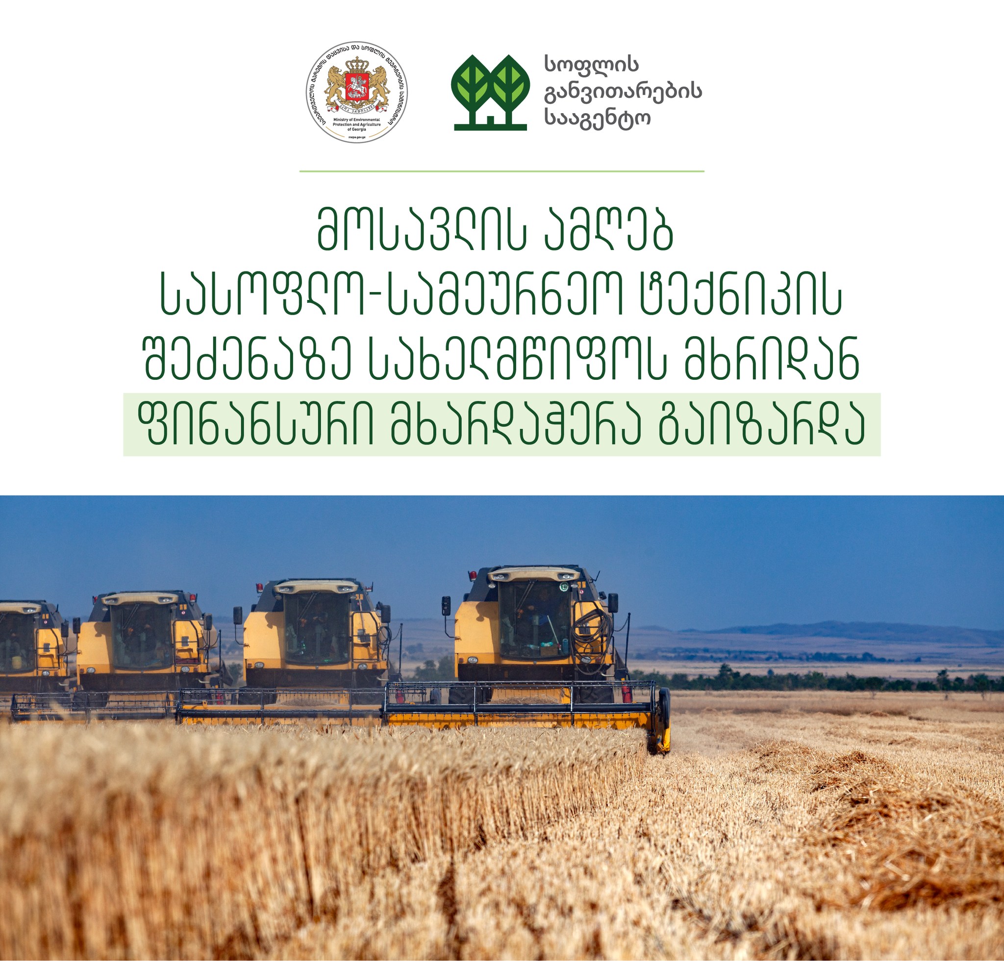 სოფლის განვითარების სააგენტოს პროგრამების ფარგლებში, თანაბრად შესაძლებელია მოსავლის ამღები ახალი და მეორადი ტექნიკის თანადაფინანსებით შესყიდვა.