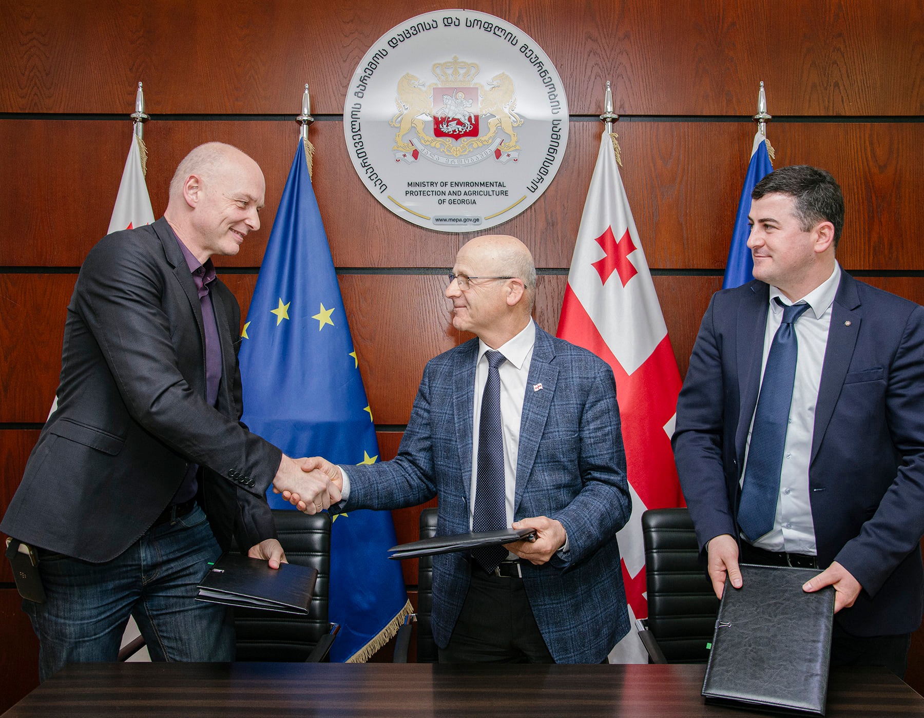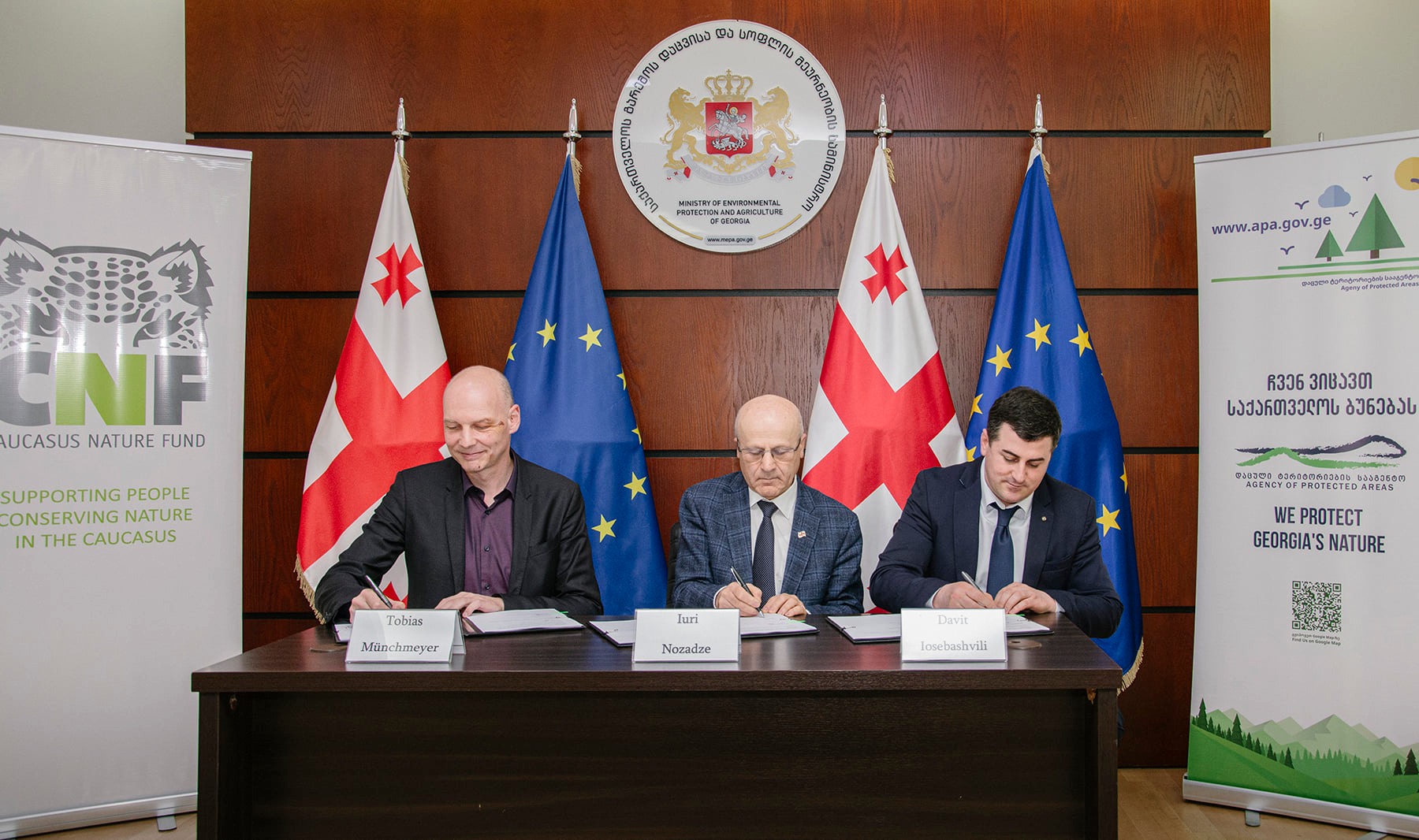 ხელშეკრულებებს ხელი გარემოს დაცვისა და სოფლის მეურნეობის მინისტრის მოადგილემ, იური ნოზაძემ, კავკასიის ბუნების ფონდის (CNF) აღმასრულებელმა დირექტორმა, თობიას მიუნხმაიერმა და დაცული ტერიტორიების სააგენტოს თავმჯდომარემ, დავით იოსებაშვილმა მოაწერეს.