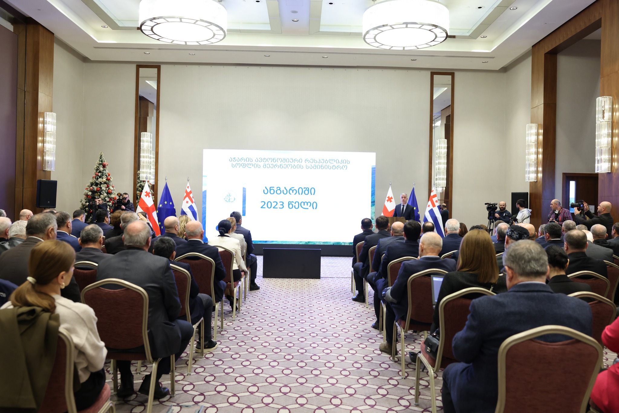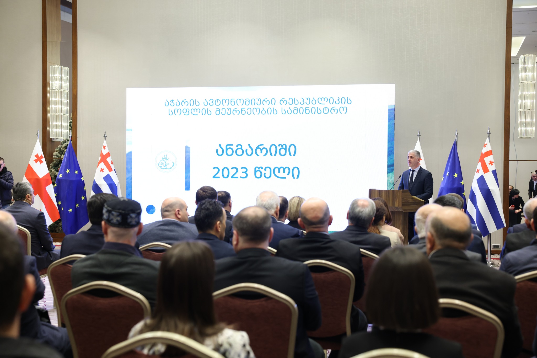 გარემოს დაცვისა და სოფლის მეურნეობის მინისტრი ოთარ შამუგია, აჭარის მთავრობის თავმჯდომარე თორნიკე რიჟვაძესთან ერთად, ბათუმში, აჭარის სოფლის მეურნეობის სამინისტროს მიერ 2023 წელს გაწეული საქმიანობის ანგარიშის წარდგენის ღონისძიებას დაესწრო. ანგარიში აჭარის სოფლის მეურნეობის მინისტრმა ზაზა შავაძემ წარადგინა.