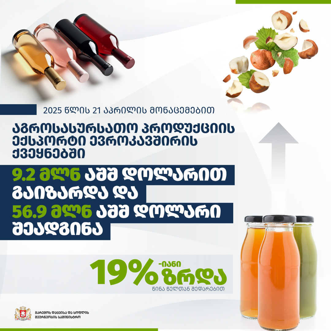 2025 წლის 21 აპრილის მონაცემებით, აგროსასურსათო პროდუქციის ექსპორტი 19%-ით, 9.2 მლნ აშშ დოლარით გაიზარდა და 56.9 მლნ აშშ დოლარს მიაღწია. ზრდა ძირითადად თხილის, ხილისა და ბოსტნეულის წვენების, ასევე ღვინის ექსპორტმა განაპირობა.