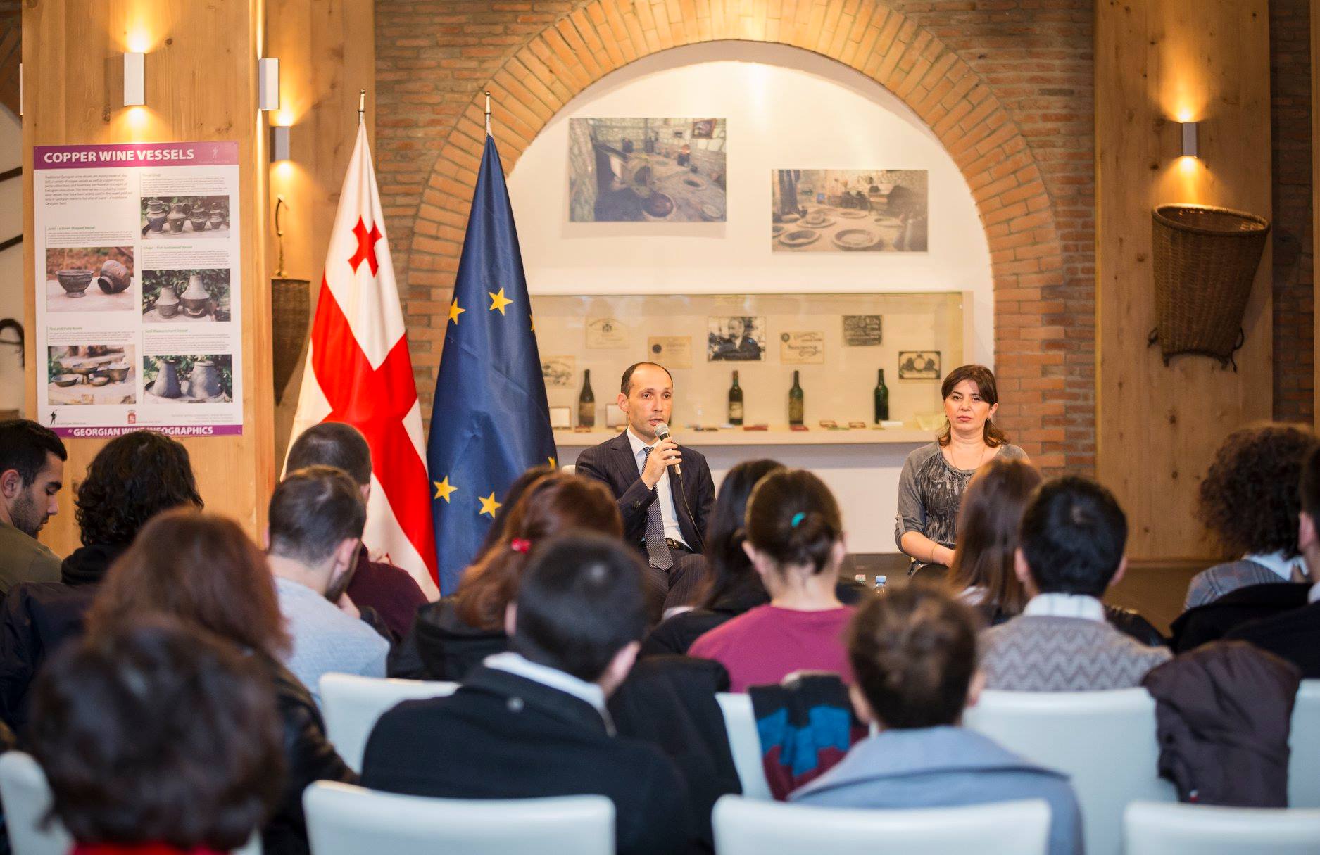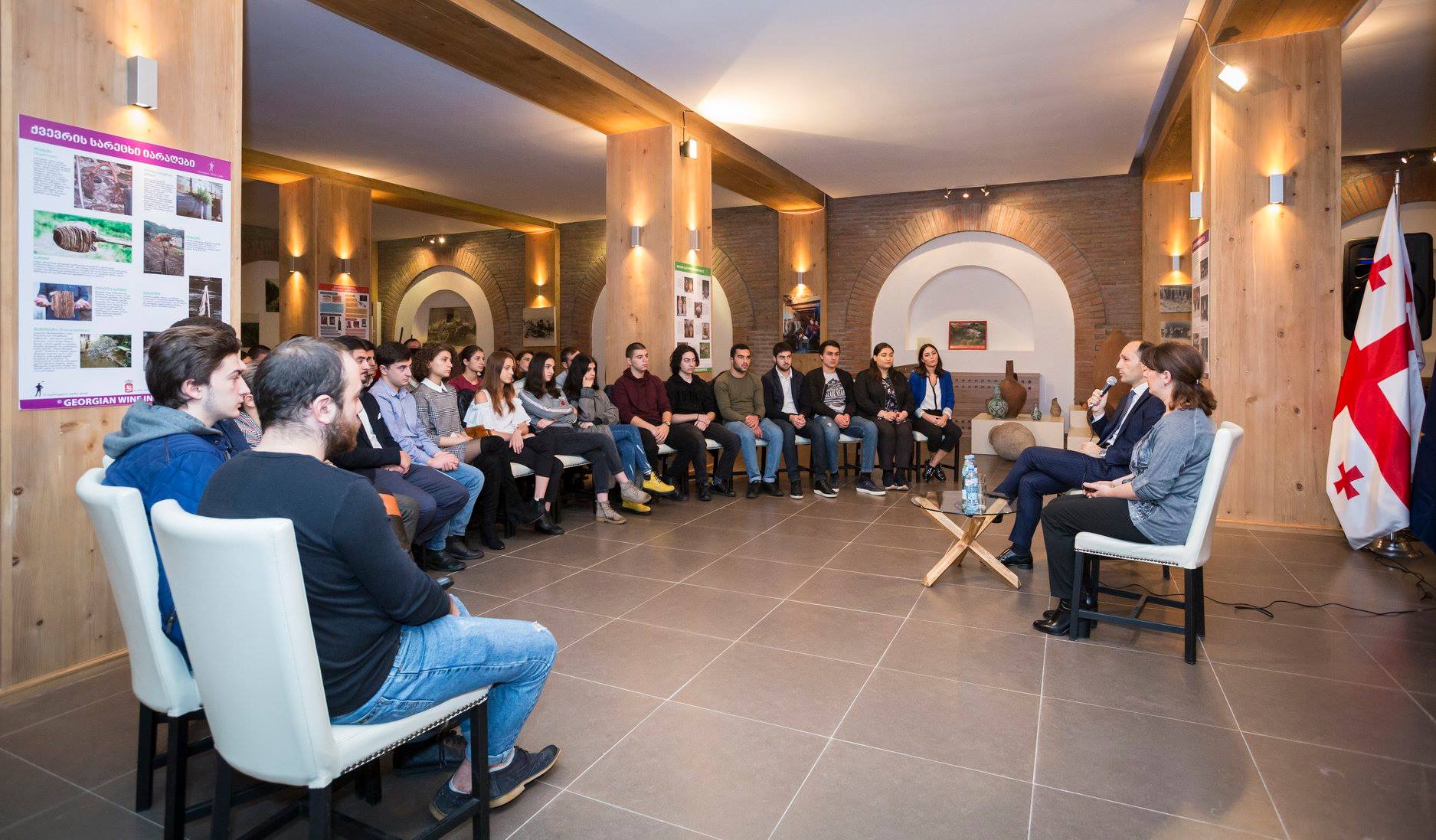 ღვინის მუზეუმში გამართულ შეხვედრაზე, მინისტრმა სტუდენტებს დეტალურად გააცნო სახელმწიფოს მიერ მეღვინეობის სფეროს განვითარების კუთხით განხორციელებული და მიმდინარე პროექტები და ყურადღება დარგის მნიშვნელობაზე გაამახვილა.