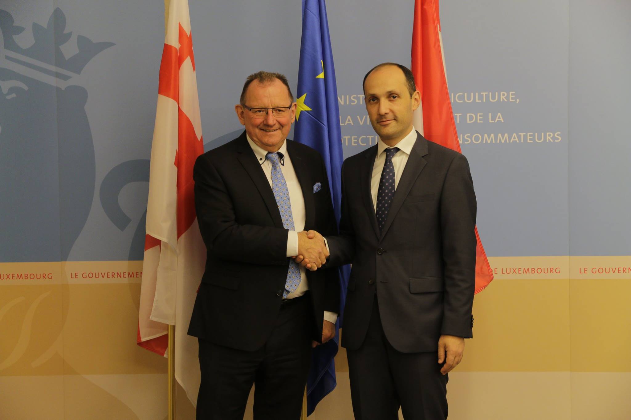 საქართველოს გარემოს დაცვისა და სოფლის მეურნეობის მინისტრი ლევან დავითაშვილი ლუქსემბურგის სოფლის მეურნეობის, მევენახეობის და მომხმარებელთა უფლებების დაცვის მინისტრს, ფერნარდ ეტგენს შეხვდა. ლუქსემბურგის სოფლის მეურნეობის, მევენახეობისა და მომხმარებელთა უფლებების დაცვის სამინსიტროში გამართულ შეხვედრაზე მხარეებმა ქვეყნებში მიმდინარე რეფორმები განიხილეს და მომავალი თანამშრომლობის სფეროები განსაზღვრეს.შეხვედრაზე ფერნარდ ეტგენმა ლუქსემბურგში მერძევეობის, მეცხოველეობისა და მევენახეობის სექტორში არსებულ მდგომარეობაზე ისაუბრა და მზადყოფნა გამოთქვა, ლუქსემბურგის მხარემ ქართველ ფერმერებს გამოცდილება გაუზიაროს.